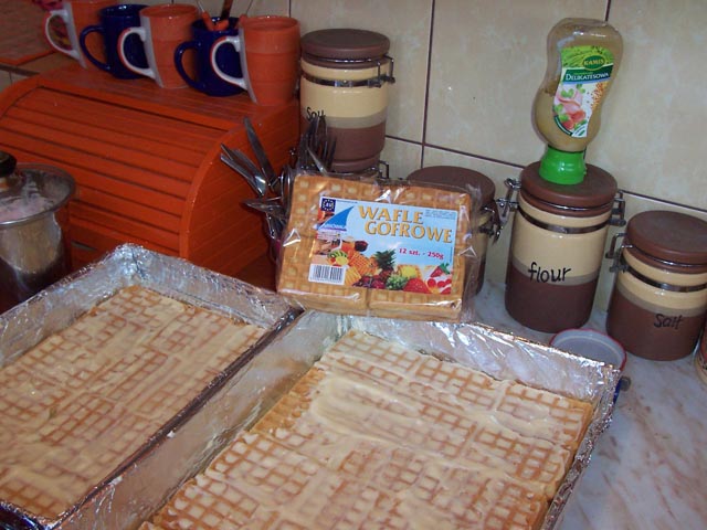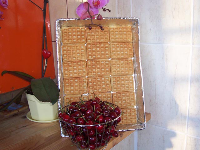 Blachę do pieczenia wykładamy goframi następnie przygotowujemy krem. Pokrywamy kremem gofry znajdujące się na blaszce. Po tej czynności nakładamy kolejną warstwę gofrów. Nakładamy ponownie krem i układamy na nim owoce. Całość zalewamy galaretką. Wkładamy do lodówki. Placek jest gotowa, gdy galaretka zastygnie w lodówce. Smacznego