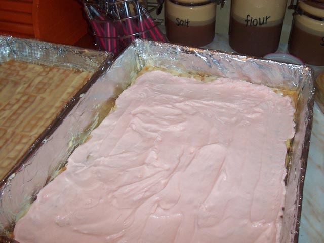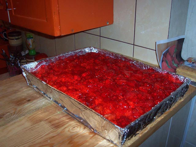 Blachę do pieczenia wykładamy goframi następnie przygotowujemy krem. Pokrywamy kremem gofry znajdujące się na blaszce. Po tej czynności nakładamy kolejną warstwę gofrów. Nakładamy ponownie krem i układamy na nim owoce. Całość zalewamy galaretką. Wkładamy do lodówki. Placek jest gotowa, gdy galaretka zastygnie w lodówce. Smacznego